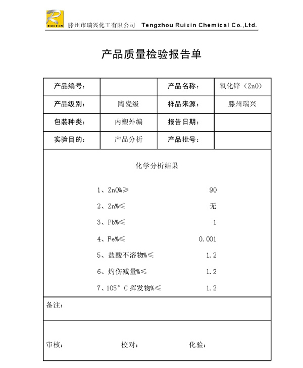 瑞興化工有限公司是生產氧化鋅的重點企業,于2008年通過ISO9001:2008質量管理體系認證。“瑞興”牌氧化鋅在國內擁有較大穩定的市場,并遠銷東南亞、中東、中南美等國家和地區,在國內外享有較高聲譽。